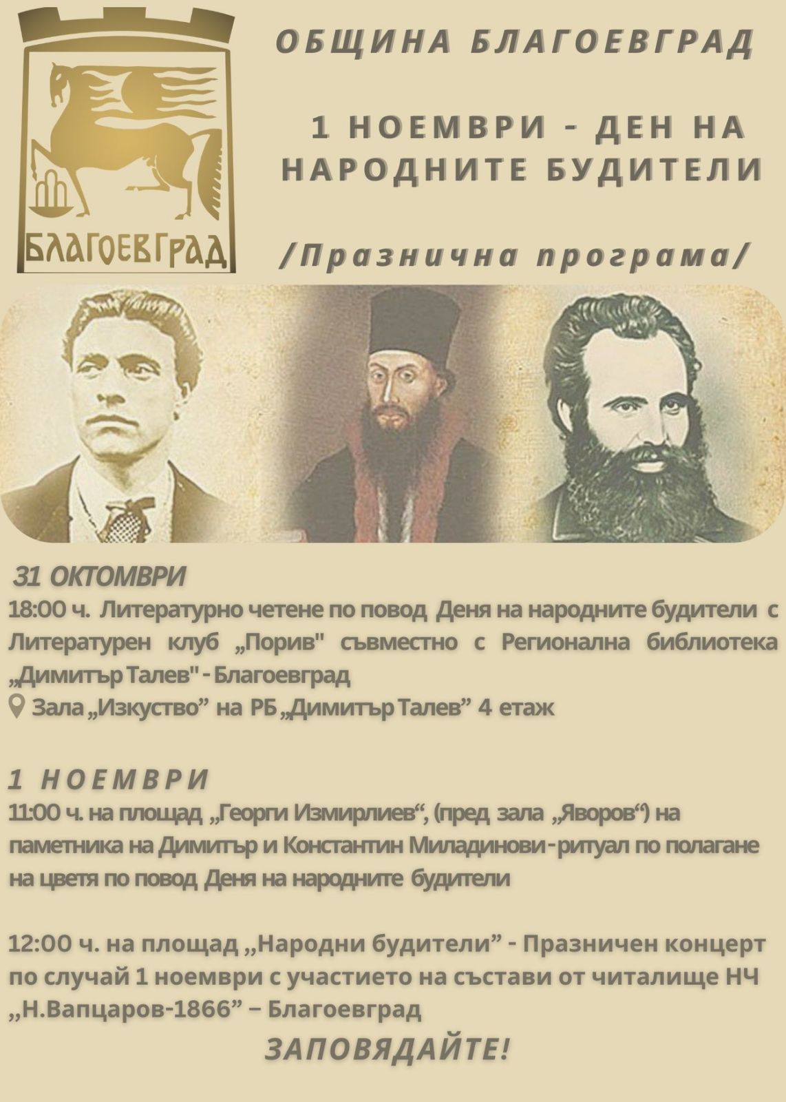 В навечерието на празника в Регионална библиотека „Димитър Талев“ ще се състои литературна вечер с четене на авторски текстове от членове на Литературен клуб „Порив“ – Благоевград.