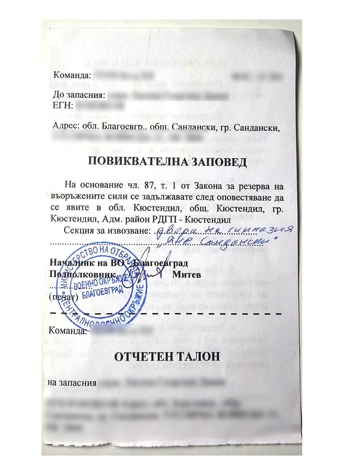 Граждани от Сандански получават повиквателни от армията