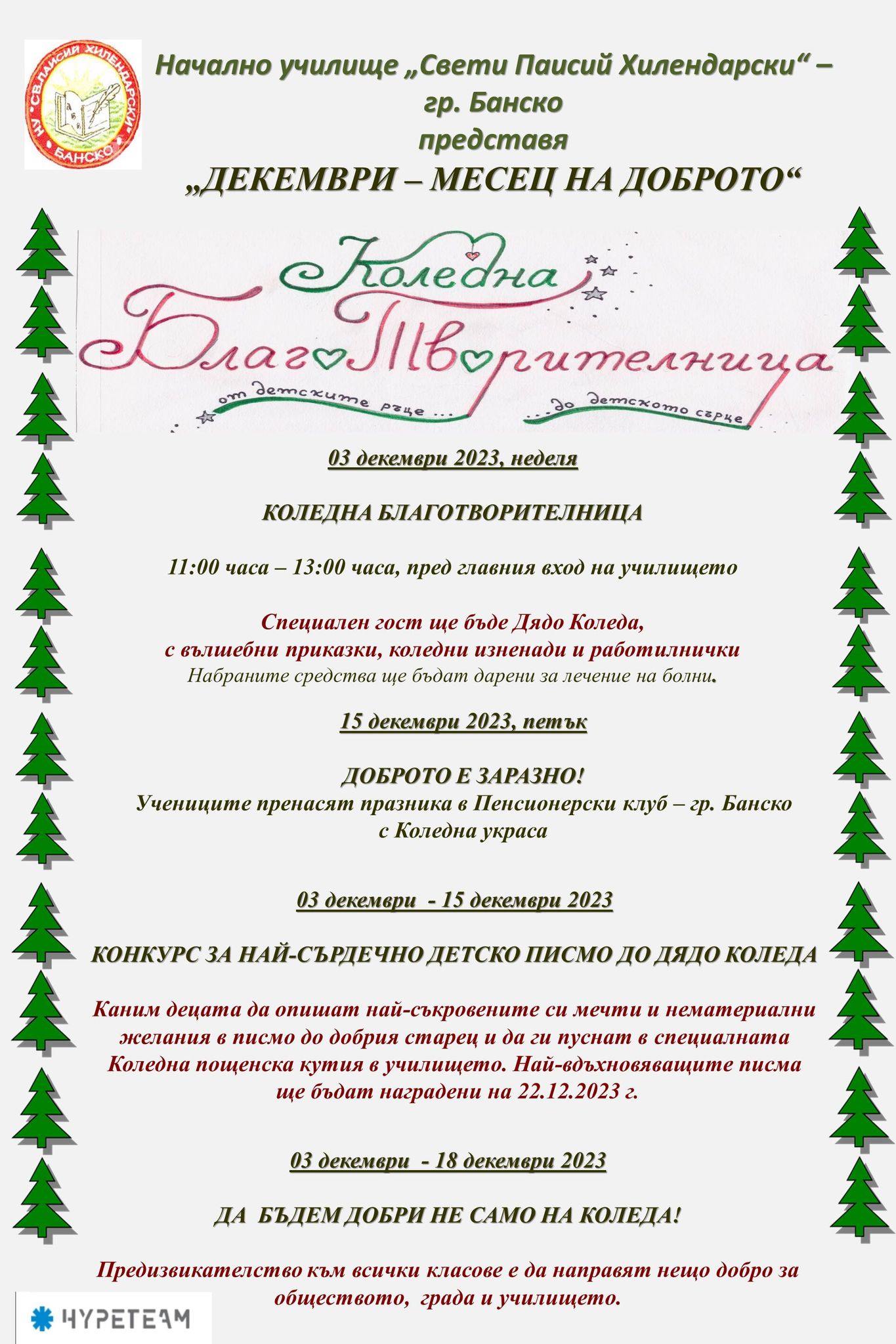 За трета поредна година, родители на деца от НУ “Св. Паисий Хилендарски“ в Банско, с подкрепата на учители и ръководство на училището, организират „Коледна Благотворителница“.