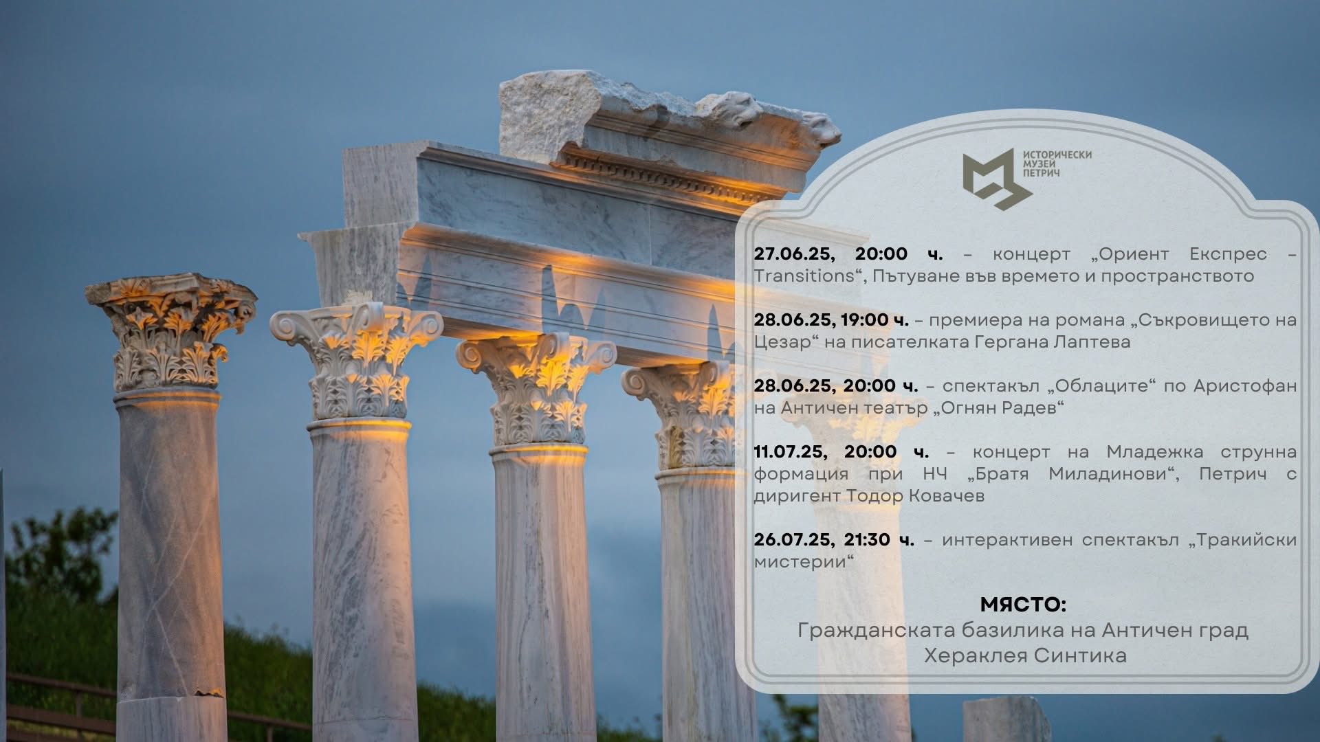 *Събитията са част от дейностите по социализация и популяризиране на Античен град Хераклея Синтика и Исторически музей Петрич и реализирането на проект „Реставрация, консервация, опазване, популяризиране и развитие на археологически обект „Античен град Хераклея Синтика и прилежащи некрополи” съгласно Договор BG16RFOP001-6.002-0016-С01 №РД-02-37-96/07.10.2020г
