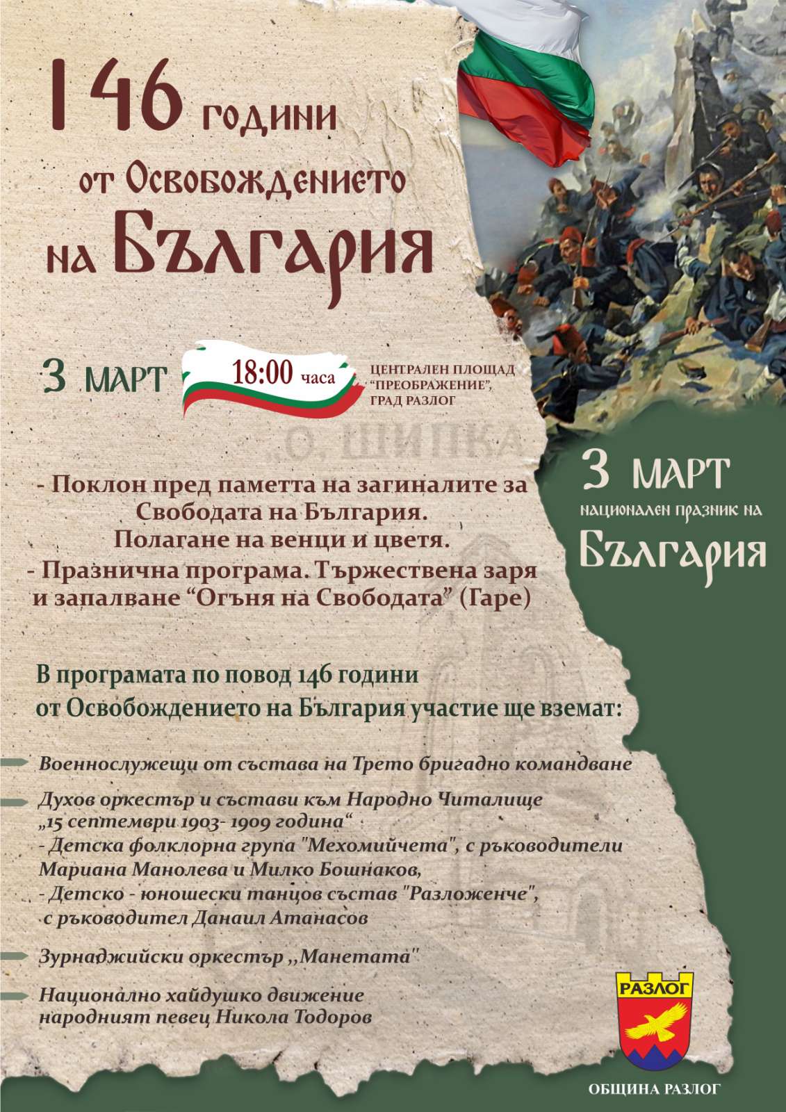 Тържествена заря и поклонение с участието на военнослужещи на Трето бригадно командване, духов оркестър, детска фолклорна група „Мехомийчета“ и танцов състав „Разложенче“, зурнаджийски оркестър „Манетата“, Национално хайдушко движение и специалното участие на Никола Тодоров!“
