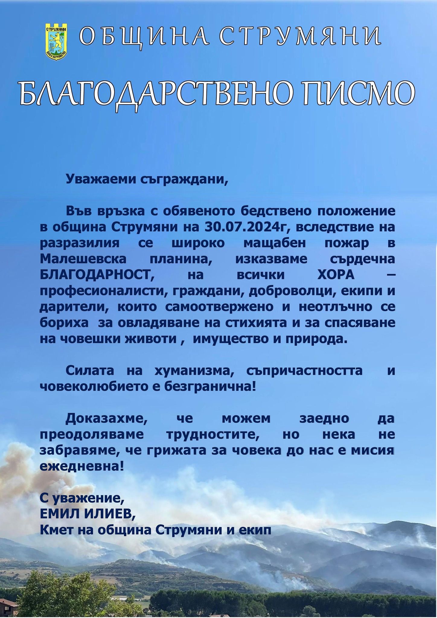 Във връзка с обявеното бедствено положение в община Струмяни на 30.07.2024г, вследствие на разразилия се широко мащабен пожар в Малешевска планина, изказваме сърдечна БЛАГОДАРНОСТ, на всички ХОРА – професионалисти, граждани, доброволци, екипи и дарители, които самоотвержено и неотлъчно се бориха за овладяване на стихията и за спасяване на човешки животи , имущество и природа.