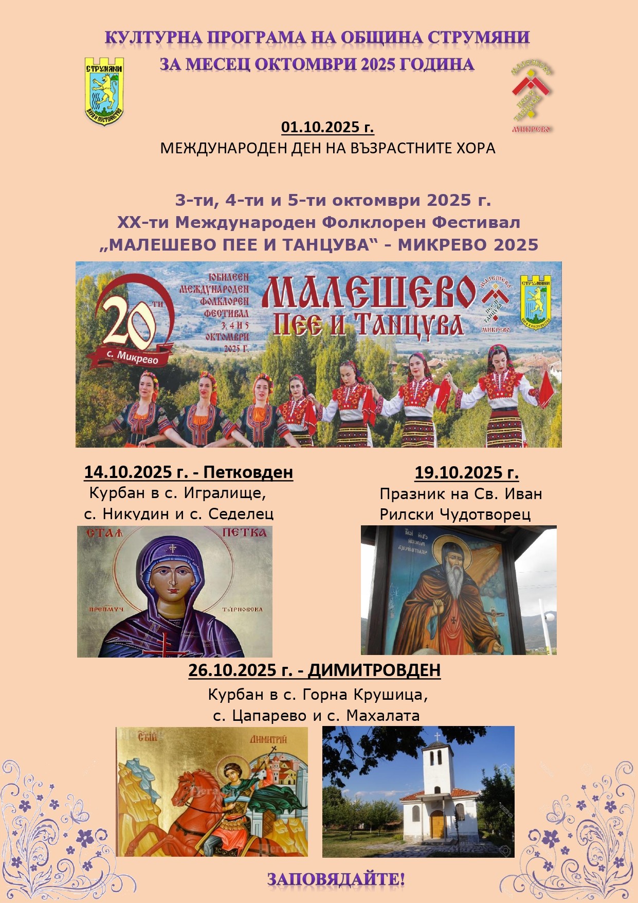 Община Струмяни представя културната си програма за октомври 2025 г., включваща празници и събития за местни жители и гости.