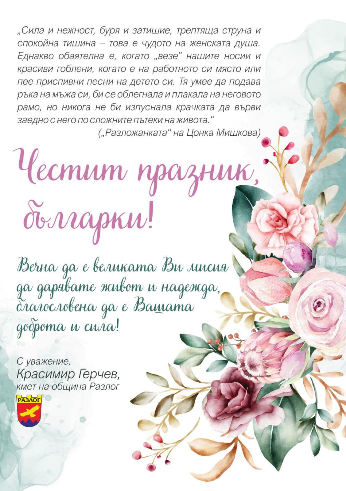 „Сила и нежност, буря и затишие, трептяща струна и спокойна тишина – това е чудото на женската душа. Еднакво обаятелна е, когато „везе” нашите носии и красиви гоблени, когато е на работното си място или пее приспивни песни на детето си. Тя умее да подава ръка на мъжа си, би се облегнала и плакала на неговото рамо, но никога не би изпуснала крачката да върви заедно с него по сложните пътеки на живота.“