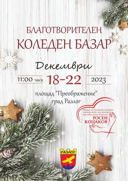 Община Разлог организира „БЛАГОТВОРИТЕЛЕН КОЛЕДЕН БАЗАР“, в периода от 18 – 22 декември 2023 година от 11:00 до 14:00 часа на централен площад „Преображение“- град Разлог.