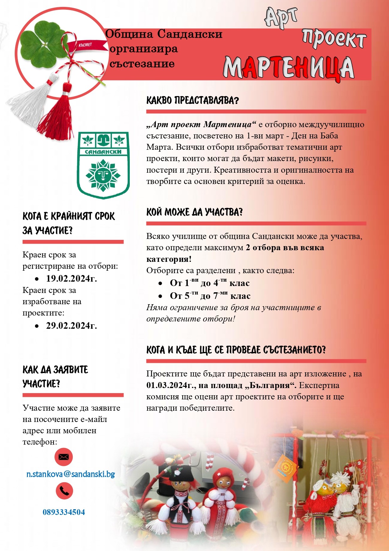 Участие може да заявите на e-mail: n.stankova@sandanski.bg или на тел. 0893334504.