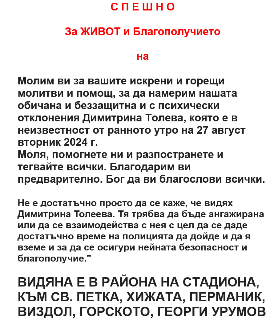 Молим ви за вашите искрени и горещи молитви и помощ, за да намерим нашата обичана, беззащитна и с психически отклонения Димитрина Толева, която е в неизвестност от ранното утро на вторник, 27 август 2024 г. Моля, помогнете ни и разпространете информацията, и тагвайте всички. Благодарим ви предварително.