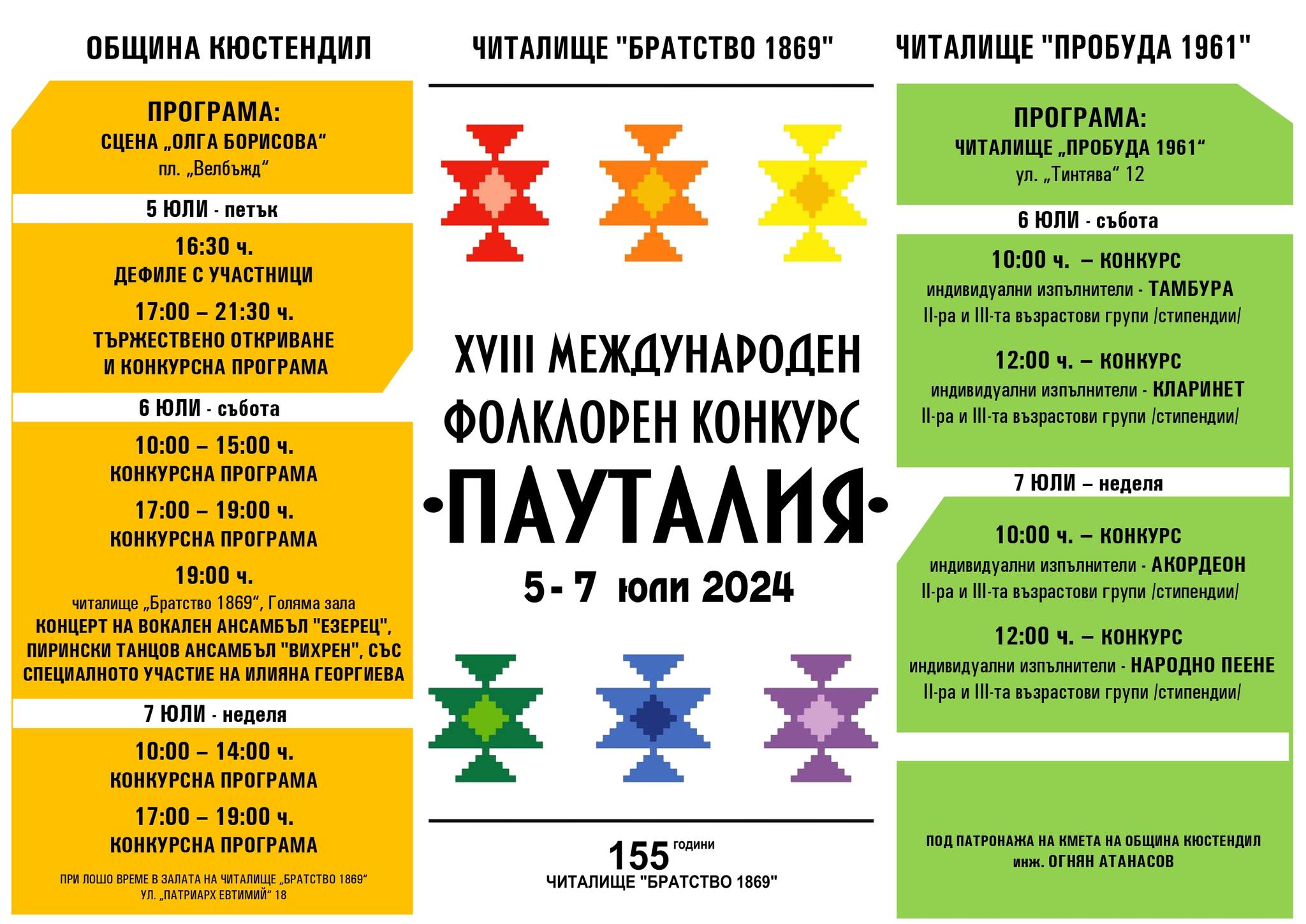 Музикалният форум се проведе в периода 5 – 7 юли 2024 г. Организатори на събитието са Община Кюстендил, читалище „Братство 1869” и читалище „Пробуда 1961” и се проведе под патронажа на кмета на Община Кюстендил – инж. Огнян Атанасов, който откри тържественото дефиле. Тази година в конкурса взеха участие над 4000 участници от цялата страна и чужбина. Снимките може да разгледате тук.  Сред наградените са: