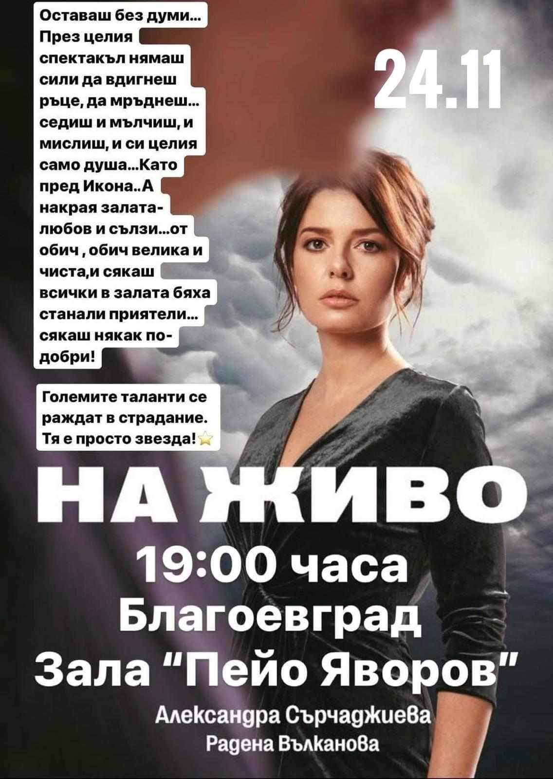 Представлението на Александра Сърчаджиева “НА ЖИВО“, насрочено за 26.10.2023 г., в зала „П.Яворов“, няма да се състои на датата,