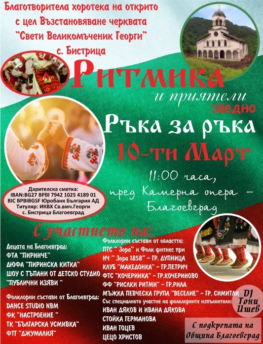 ФФ „Ритмика“ и приятели с благотворителна хорокетка „Ръка за ръка“ за възстановяване църквата „Свети Великомъченик Георги“ в село Бистрица, община Благоевград