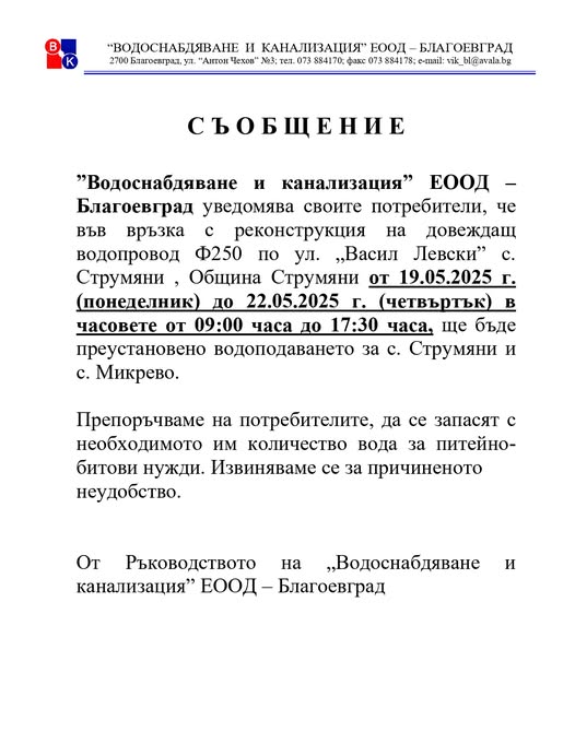 ”Водоснабдяване и канализация” ЕООД – Благоевград уведомява своите потребители, че във връзка с реконструкция на довеждащ водопровод Ф250 по ул. „Васил Левски” с. Струмяни , Община Струмяни от 19.05.2025 г. (понеделник) до 22.05.2025 г. (четвъртък) в часовете от 09:00 часа до 17:30 часа, ще бъде преустановено водоподаването за с. Струмяни и с. Микрево.