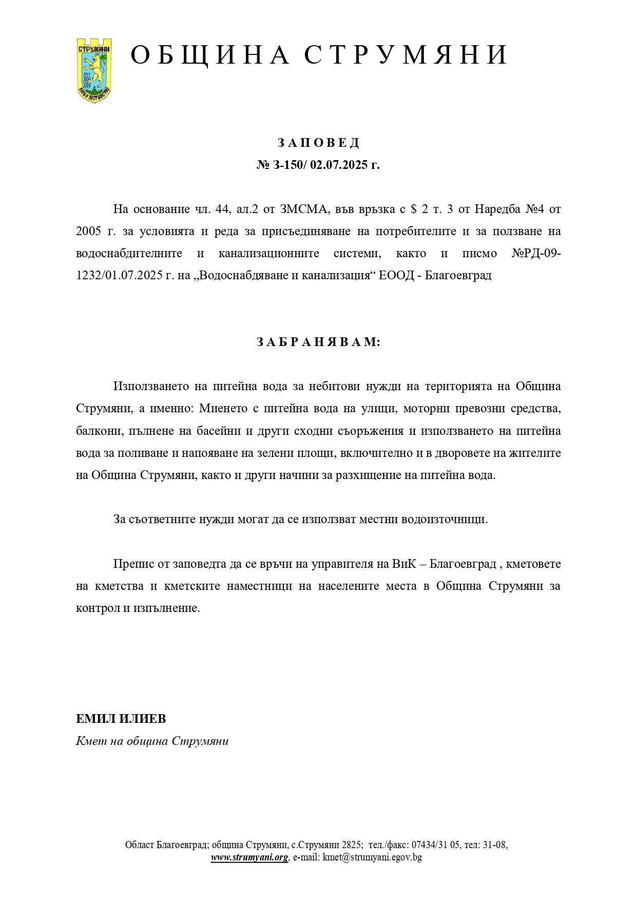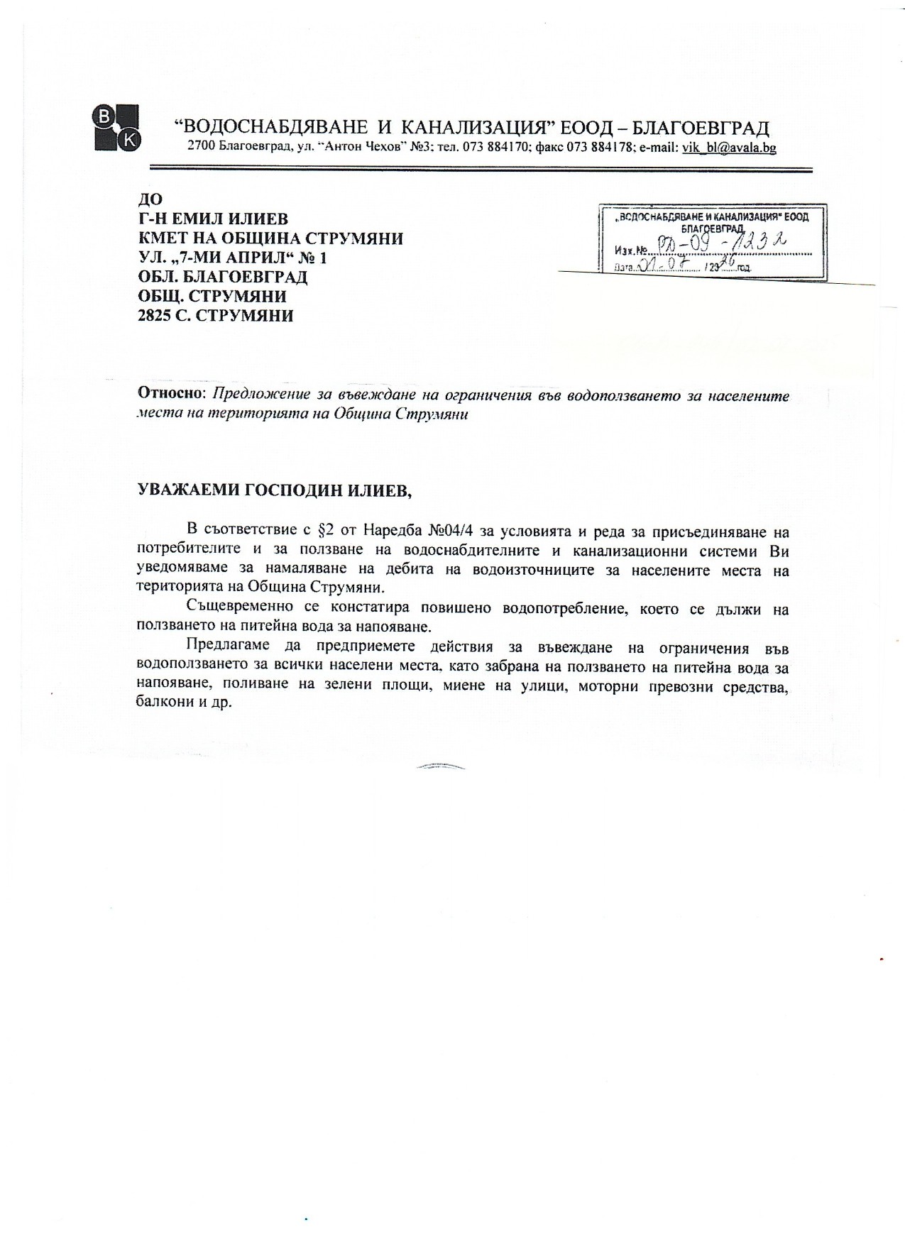 Предвид горещите летни дни и във връзка с писмо от „Водоснабдяване и канализация“ ЕООД – Благоевград, Община Струмяни отправя призив за превантивни действия с цел опазване на водните ресурси.