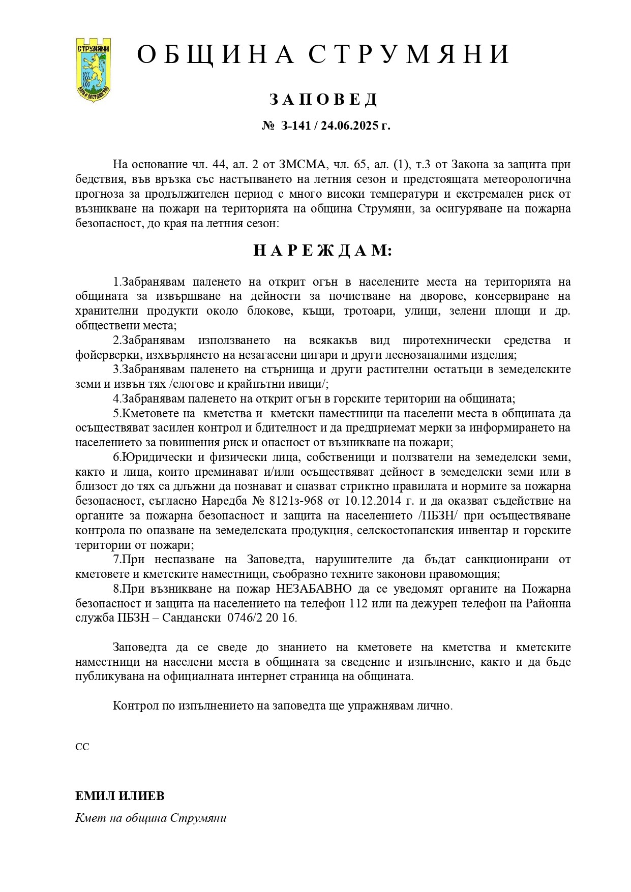 Със Заповед № З-141/24.06.2025 г. на кмета на общината се въвеждат следните забрани:
