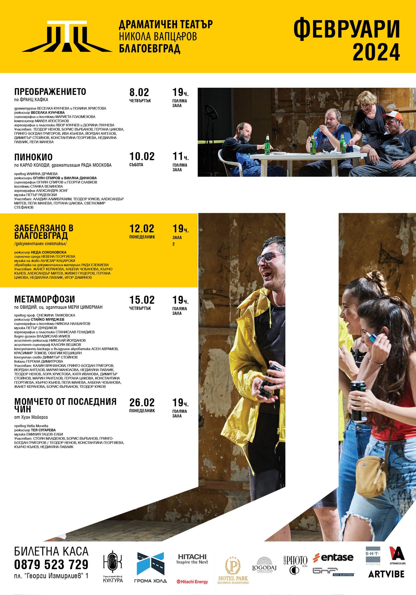 В месеца на любовта и виното може да гледате едни от хитовите спектакли на Драматичен театър „Никола Вапцаров“. Програмата започва на 8 февруари с представлението „Преображението“. Спектакълът разказва историята от добре