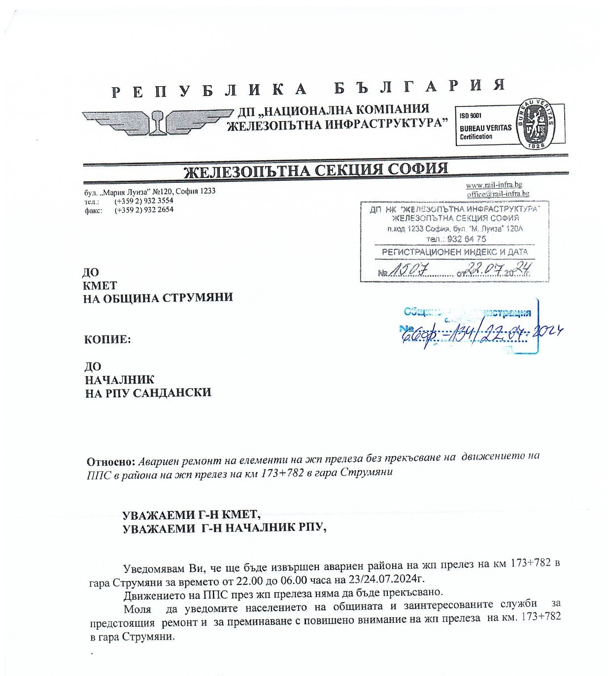 Във връзка с получено писмо от „Железопътна секция“ София, която информира за предстоящ ремонт на елементи на жп прелеза в с. Струмяни, Ви молим за повишено внимание при преминаване на жп прелеза в с. Струмяни за времето от 22:00 до 06:00 часа на 23/24.07.2024 г. (вторник/сряда).Движението няма да бъде прекъсвано!