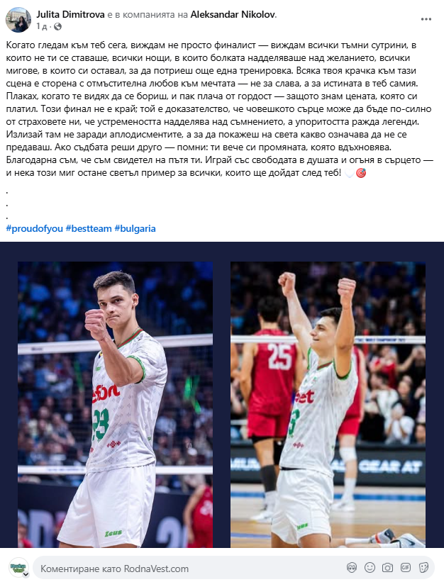 Тя припомни как България достигна решителния мач. Подчерта усилията на Алекс и отбора: Братята Николови изведоха България до исторически финал на Световното по волейбол и България победи Чехия с 3:1 и се класира за исторически финал на Световното по волейбол. Юлита призна, че е плакала, наблюдавайки тези моменти. Чувството на гордост е още по-силно сега.
