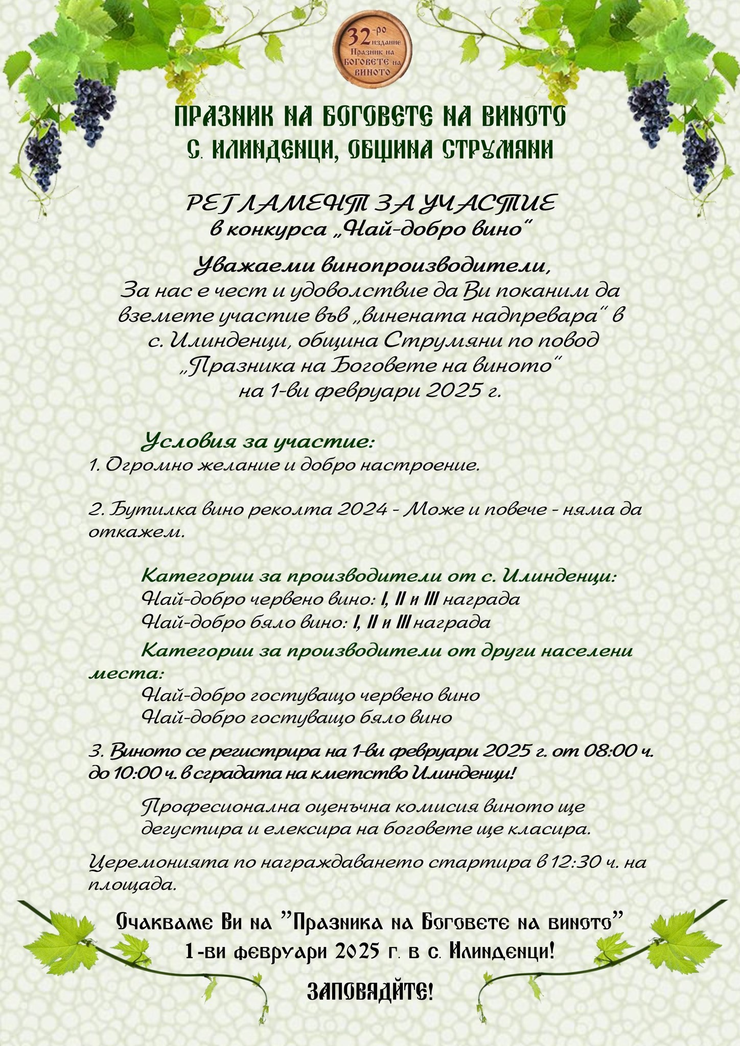 по повод „ПРАЗНИКА НА БОГОВЕТЕ НА ВИНОТО“ на 1-ВИ ФЕВРУАРИ 2025 г. в село ИЛИНДЕНЦИ, община Струмяни,